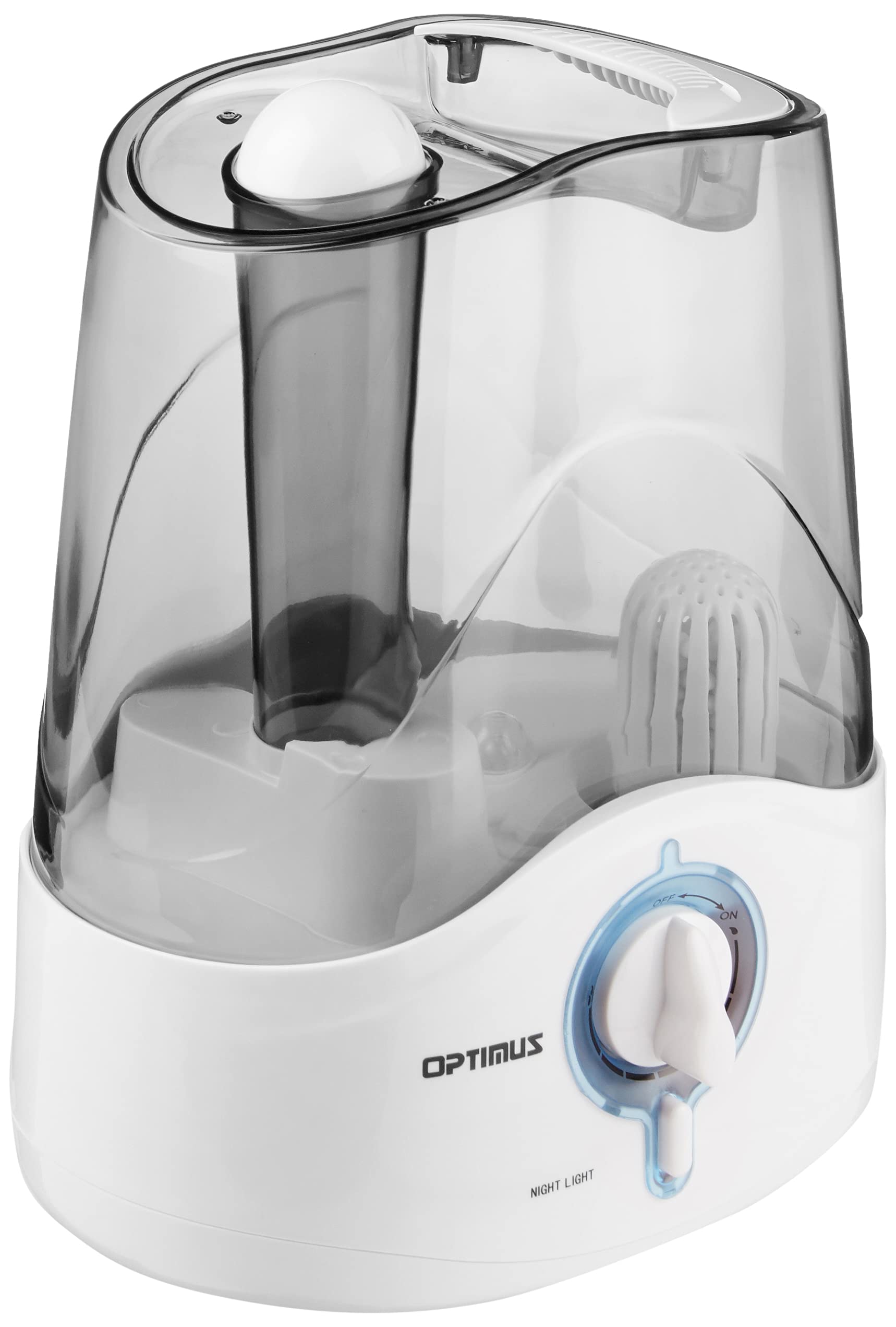 This Optimus cool mist ultrasonic Humidifier has a 1.11 gallon tank capacity and outputs 1.5 gallons in 18 hours. It features a water empty automatic shut off switch and refill light and has an adjustable mist volume control. Contains a removable transparent tank with handle for easy removal and transport and has a whisper-quiet operations so it won't disturb sleep.