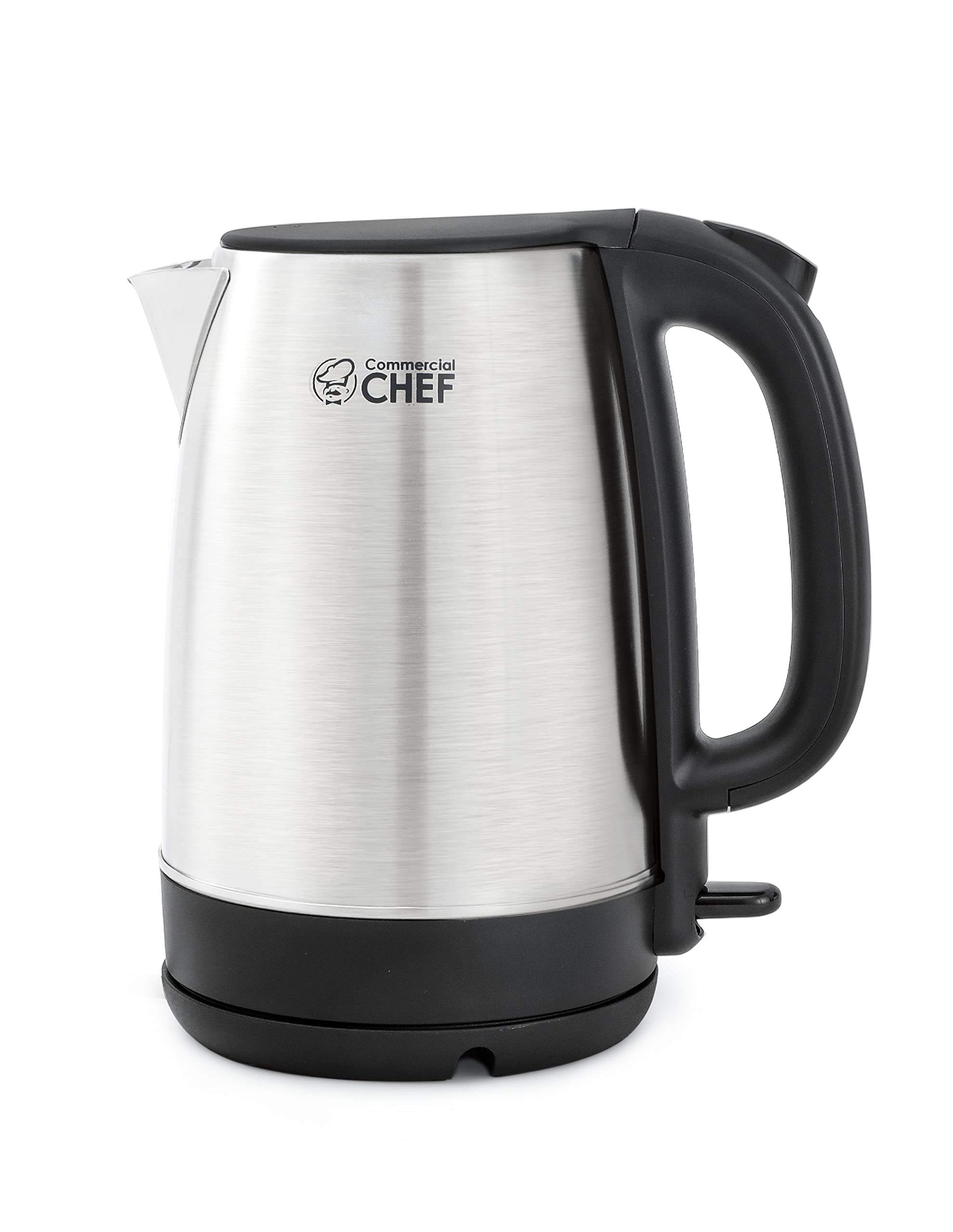 This Commercial Chef Cordless Stainless Steel Electric Kettle has a 57-oz. (1.7-L) capacity and is made with a brushed 304 stainless steel body. Cordless kettle includes a removable tea filter. The pop-up lid opens easily with a push button for 1-handed use. A wide mouth opening allows for easy filling and cleaning. Its detachable base for cordless use also allows the kettle to rotate 360° for convenient pour and serve. Safety features include power switch light, auto shutoff, boil-dry protection, and Strix Control technology which automatically turns the kettle off when turned on without water, temperatures reach boiling, or when the kettle is lifted from the base. The power cord conveniently wraps in the base.